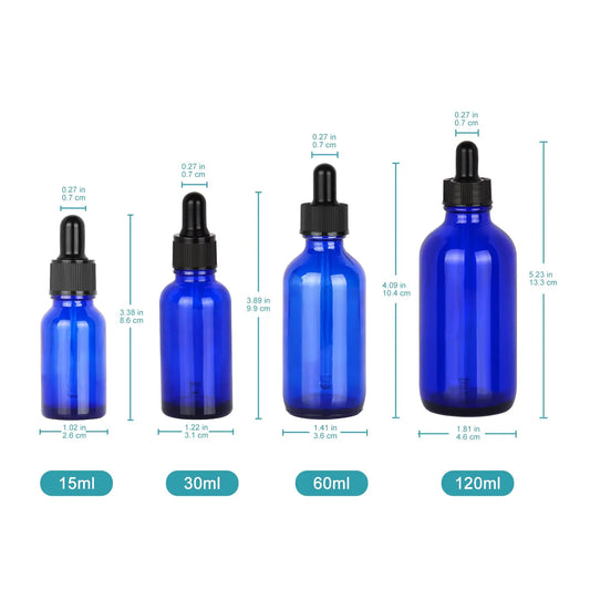 Cobalt Dropper Bottle, Glass Dropper with Inner Plug and Label, 15-120 ml
