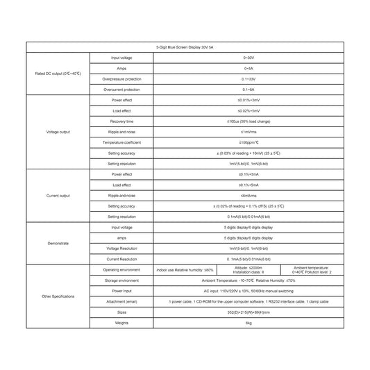 DC Power Supply, 0–30V 0–5A, 0.1 mA Resolution, High-Resolution Blue Screen Display