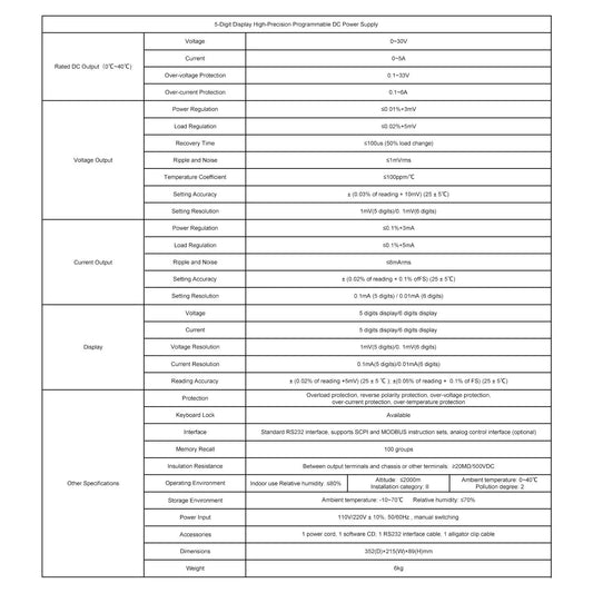 DC Power Supply, 0–30V 0–5A, 0.1 mA Resolution, Programmable High-Resolution Display