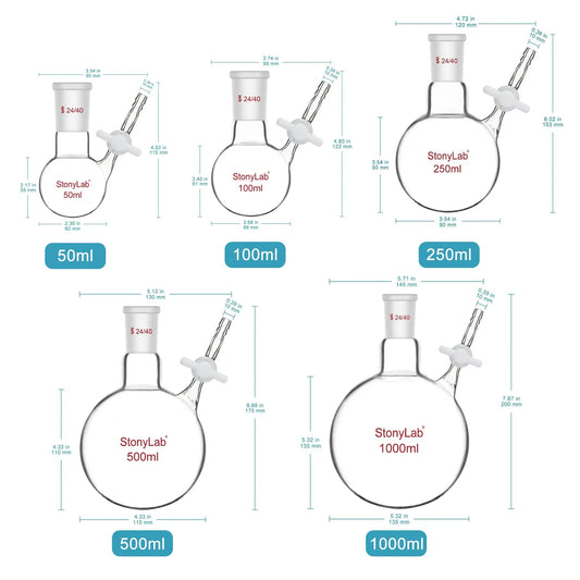 Round Bottom Reaction Flask, 24/40 Joint, PTFE Stopcock Valve, 50-1000ml