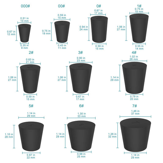 Black Rubber Stoppers, Solid, Size #000 - #12