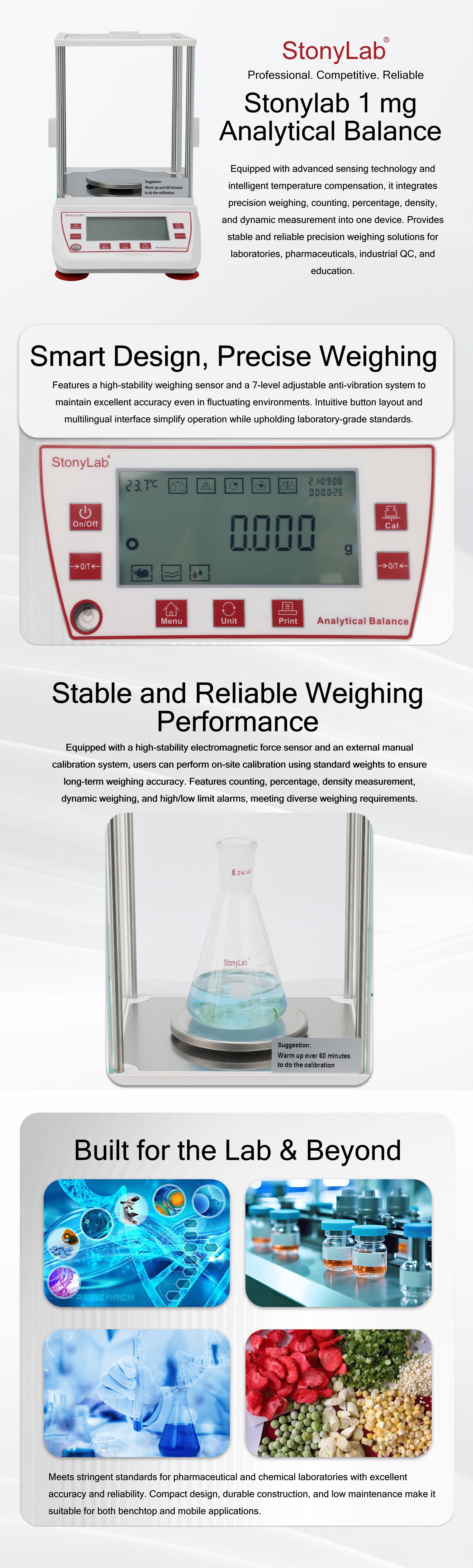 - 1 mg High-Precision Weighing: uses electromagnetic force sensor technology to deliver a 0.001 g (1 mg) readout, with ±0.002 g repeatability and ±0.002 g linearity, ensuring accurate and consistent measurements