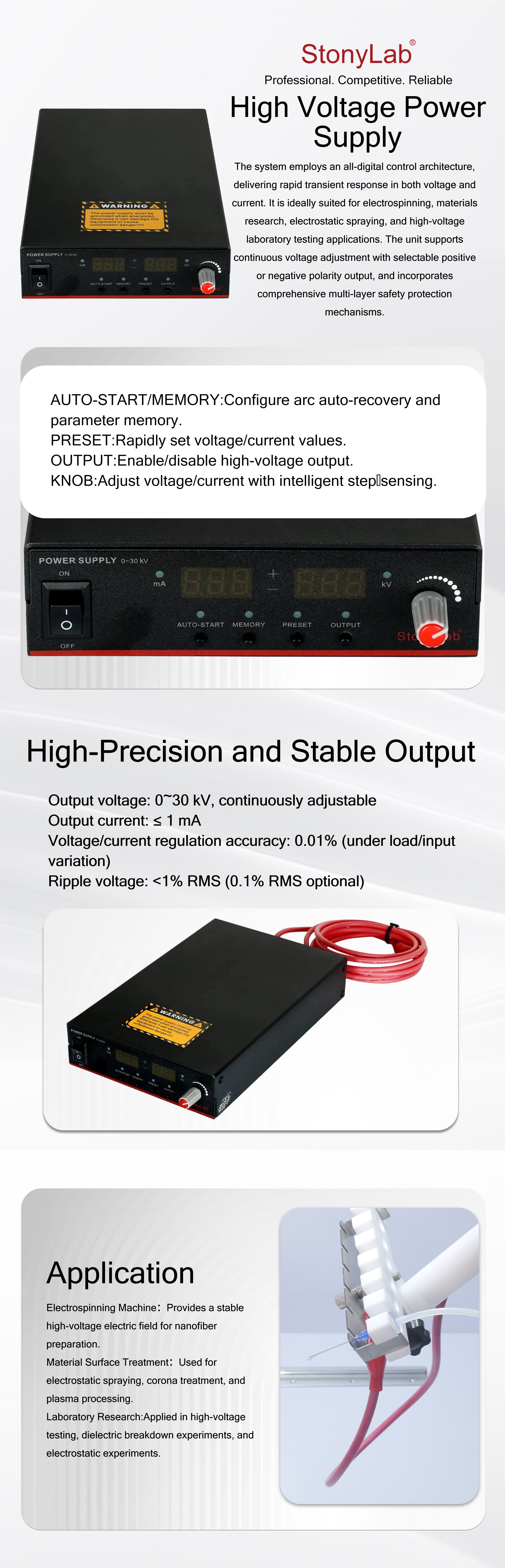- Adjustable Voltage: Features an adjustable voltage output with a broad range from 0 to 30 kV (Optional: 0 to ±30 kV), allowing for precise control