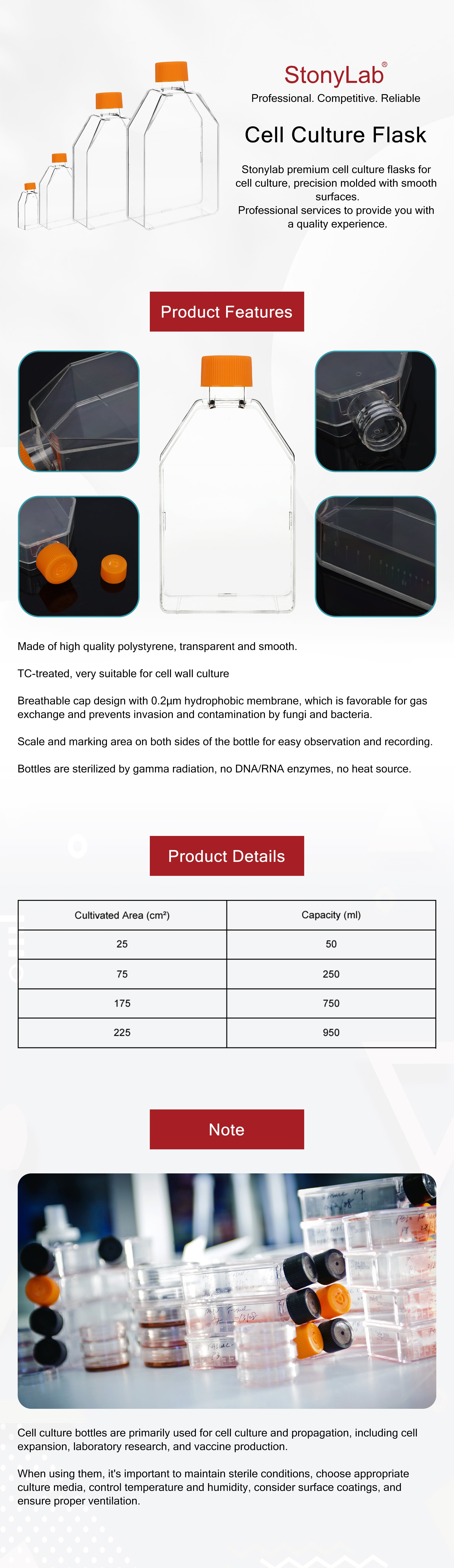 - Design and Application: Designed for adherent cell culture growth, these cell culture bottles are suitable for a wide range of applications in biological experiments, teaching, and scientific research.