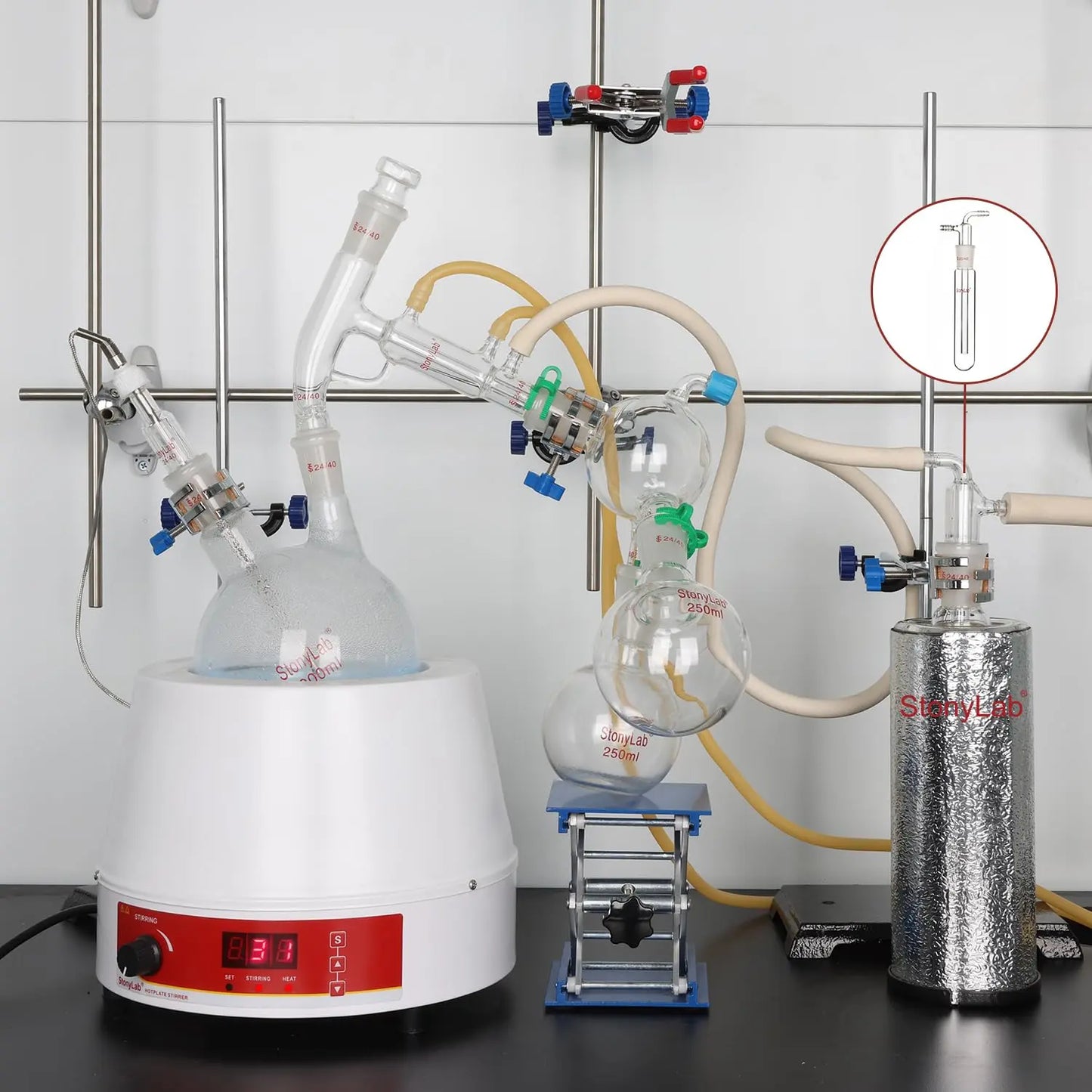 This is the final trap in my distillation system. It sits in either an ice and rock salt bath or wrapped in paper and inserted in dry ice in a modified cooler (drilled a hole in the lid, and a second relief hole, for off gassing any CO2,) The tube sits through the lid, keck clip snugly affixed, and vacuum attached. Center tube is straight down the center, and there are no blemishes on the glass or deformations (air bubbles, thin spots) visible. I have continuously operated it under vacuum while in the cooler to trap solvent (as well as rogue terpenes that evaporate during warm up.) The glass is ground nicely, the grinds are true ST 24/40, even though this is designed to be used assembled, chilled, and connected to vacuum. Great price, great little trap. When doing extractions under vacuum, or distilling under vacuum, a trap is a definite pump saver, and worth the investment.