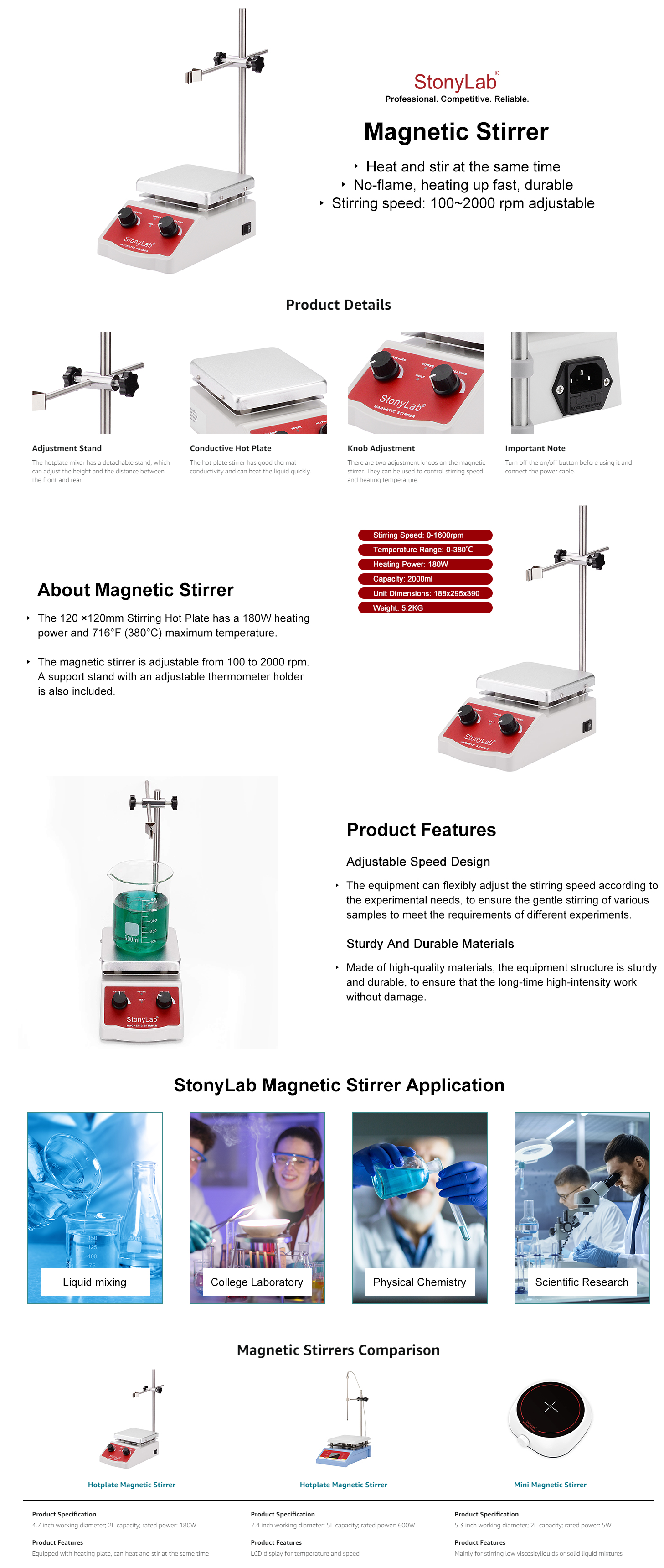 - StonyLab YQ-701036 magnetic stirrer with aluminum alloy working plate that is uniform thermal conduction, heat- and chemical-resistant