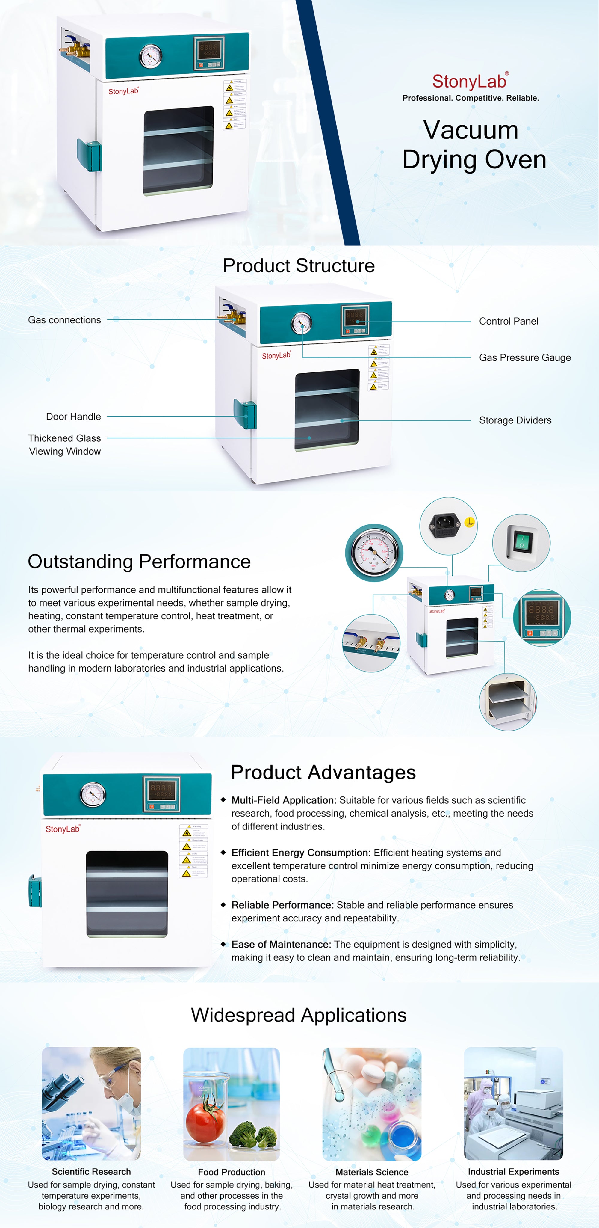 - Product Overview: StonyLab vacuum oven is professionally designed for drying, heating, and more applications in chemistry, laboratory, biology, research and others with simply, user-friendly operation