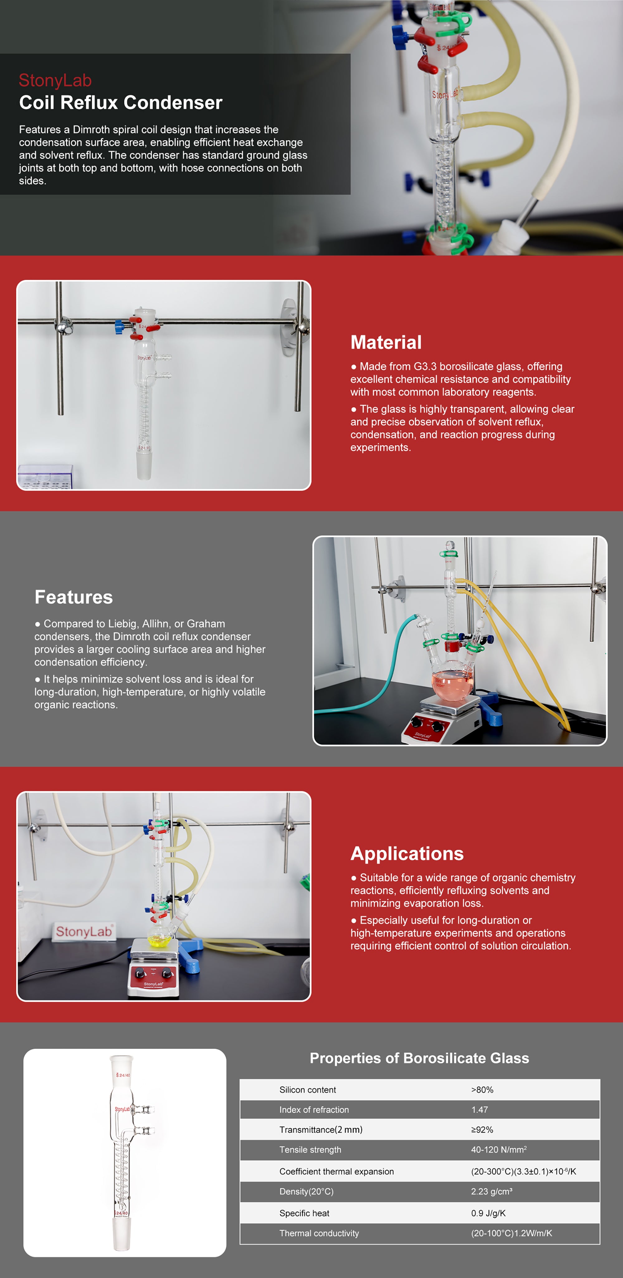 Glass Dimroth Coil Reflux Condenser with 24/40 Joints and Hose Connections