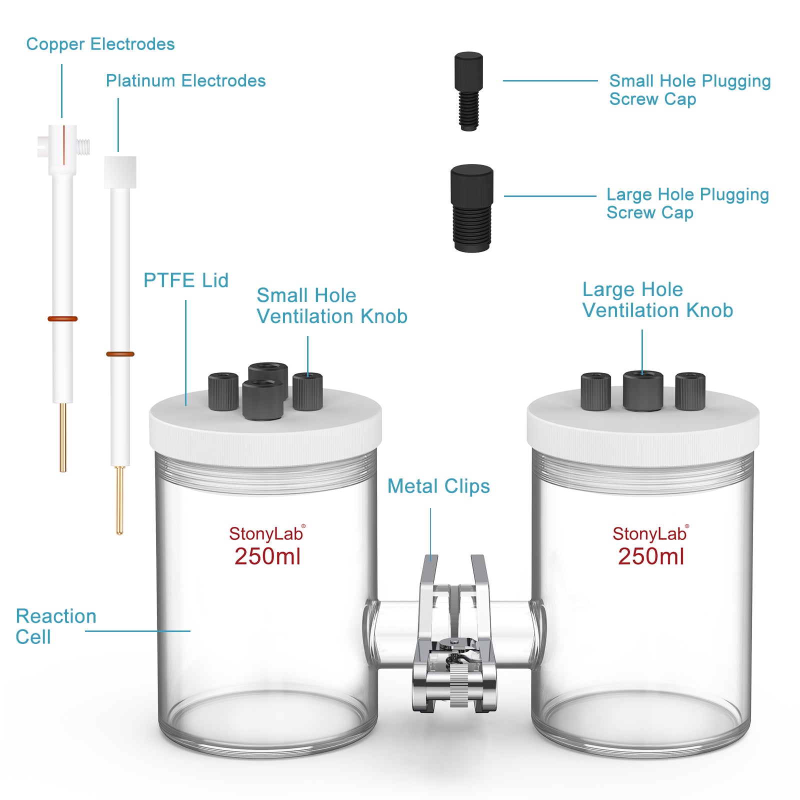 - Complete Component Set: Components include 2x borosilicate glass cell, hollow screws and sealing screws, 2x PTFE cell lid, gasket silicone seal, 1 metal clip, together with 1 copper electrode holder and 1 platinum electrode