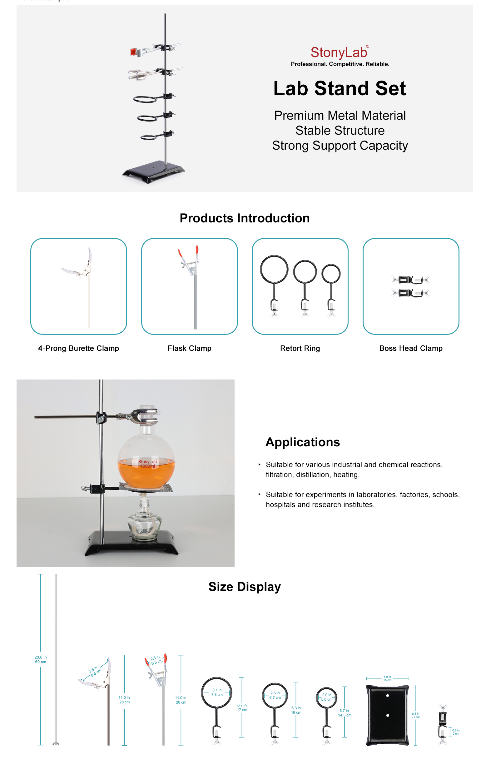 - This set includes a stand base (15 x 21 cm / 5.9 x 8.3 inches), one rod (60 cm / 23.62 inches), 3 retort rings sizing 7.6 cm / 2.0 inch, 6.7 cm / 2.6 inch and 5.0 cm / 3.1 inch, 2 flask clamps (28 cm / 11 inch L), and 2 boss head clamp holders