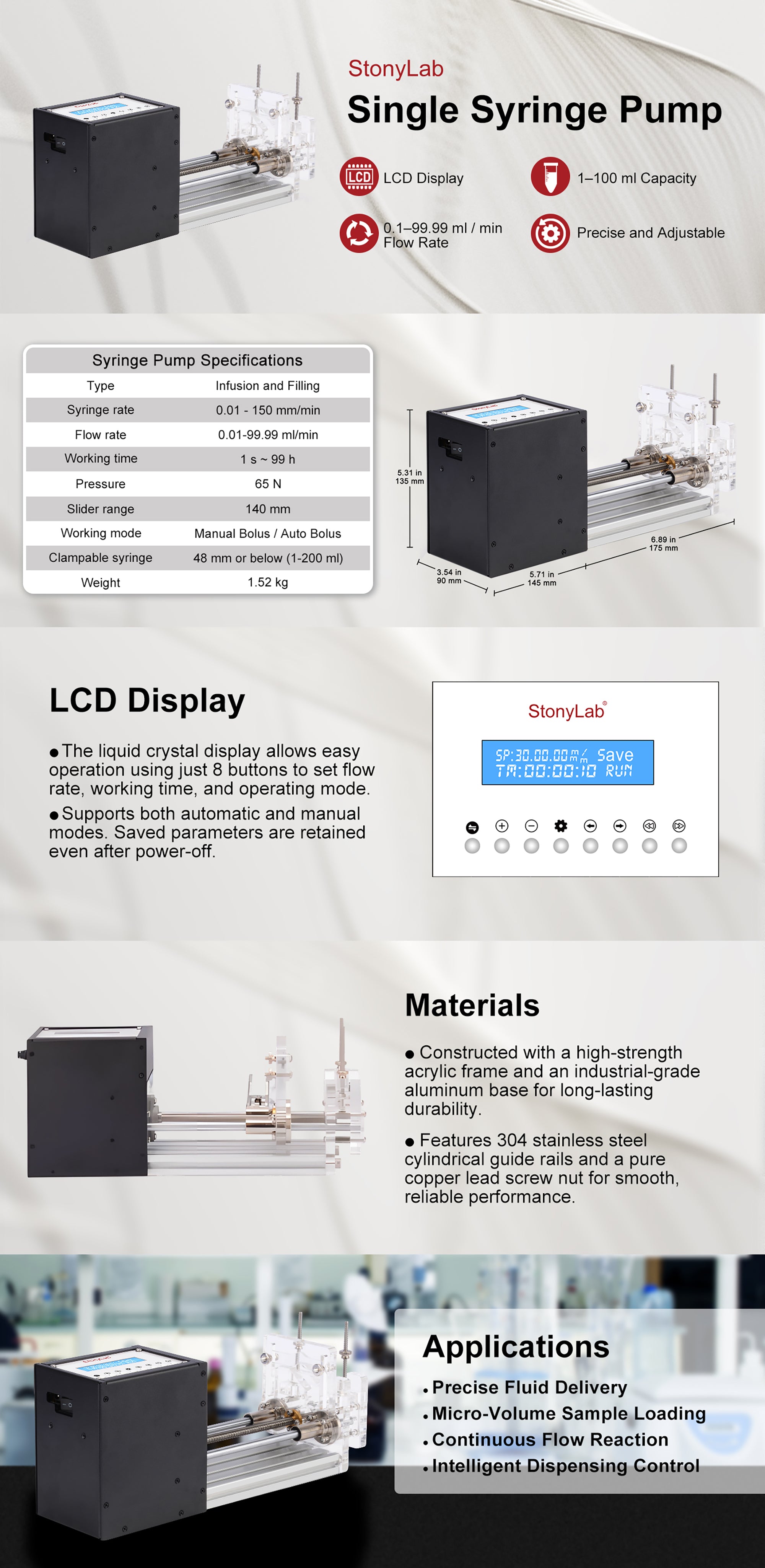 - StonyLab Microfluidic Single Syringe Pump is professionally designed to integrate precision flow into analytical instruments for versatile purposes