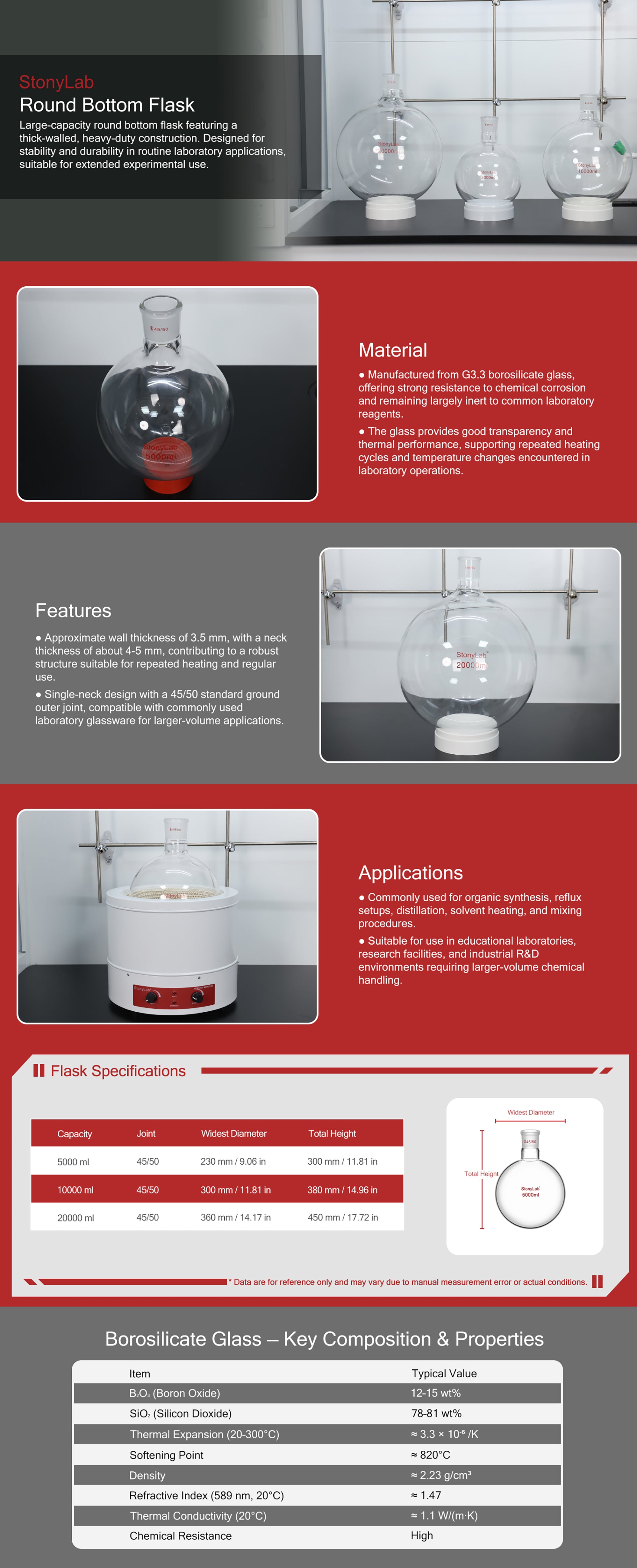 Geometry & Heat Transfer: spherical (round-bottom) profile for uniform heat distribution and efficient magnetic/overhead stirring; compatible with heating mantles and oil baths