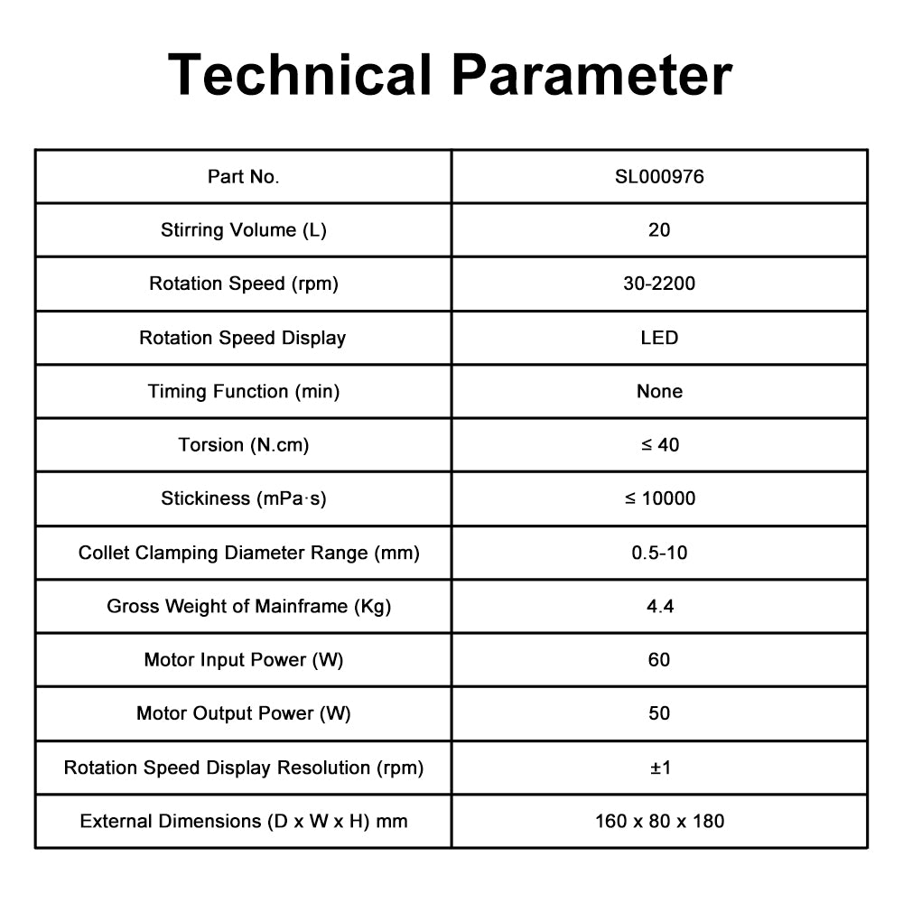 - Speed: 30 - 2200 rpm; maximum applicable viscosity: 10000 mPa/s; torque: 40 N.cm