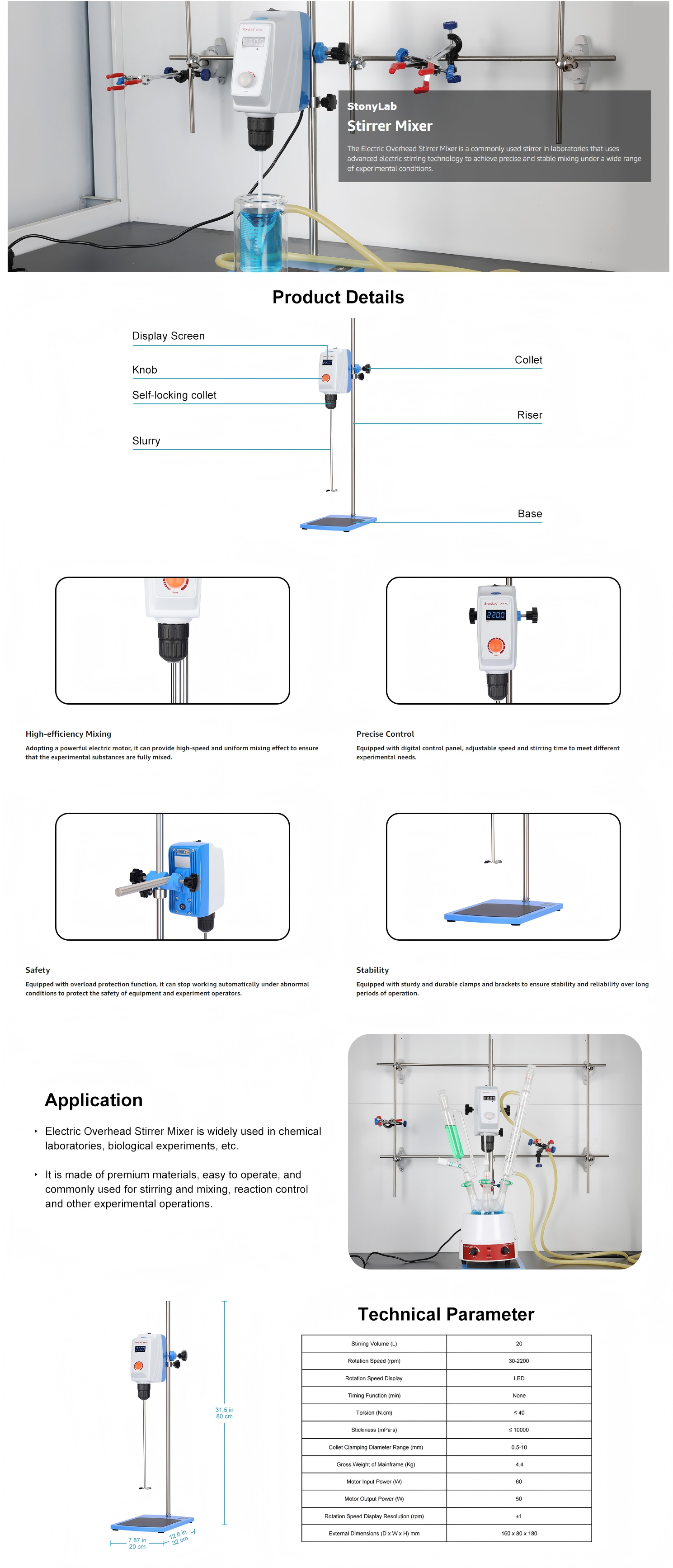 - StonyLab overhead stirrer mixer is a dependable and enduring option for blending various laboratory samples, allowing for efficient mixing of liquids or solutions in various containers, such as beakers or flasks