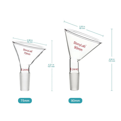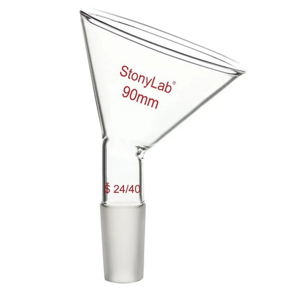 This funnel is constructed of thick borosilicate glass and has a perfectly ground 24/40 short taper stem.