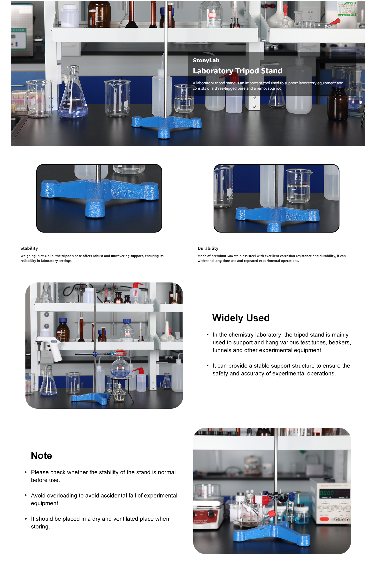 - Serves as a dependable fixture for supporting a range of instruments, commonly employed in experiments involving filtration and heating processes; suitable for a variety of industries and chemical reactions, filtrations, distillations, heating, and experiments in laboratories, factories, schools, hospitals, researches, and more