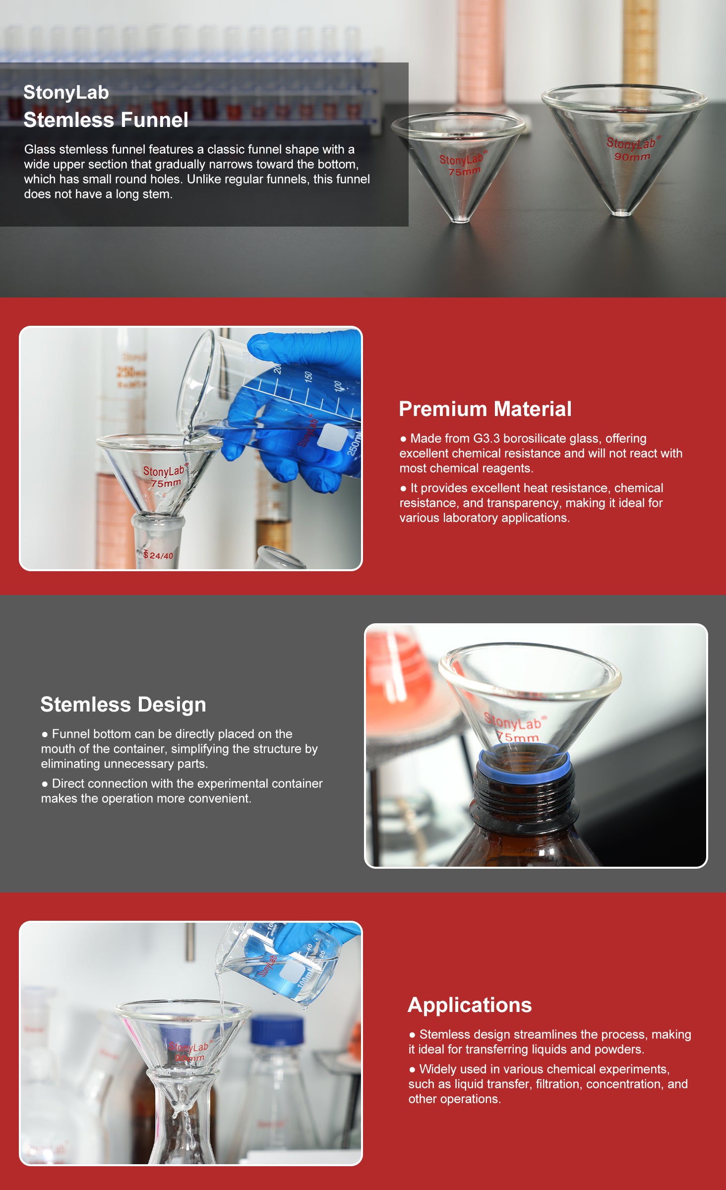 Liquid flows smoothly along the funnel wall, easy to clean after the experiment, leaving no stains or reagent residue.