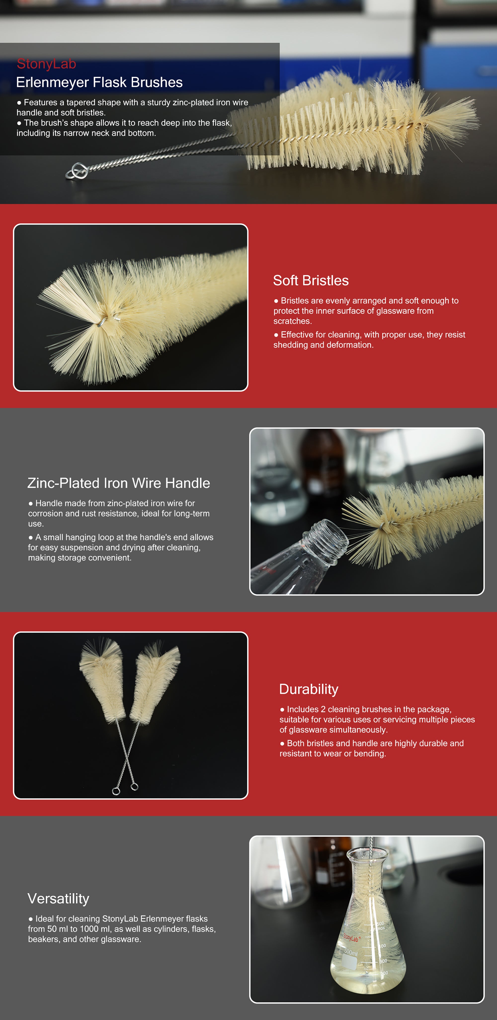 - Multi-Use Laboratory Cleaning Tool: can be used for scrubbing 50-1000 ml Erlenmeyer flasks, as well as beakers, cylinders, and test tubes, without causing any damage