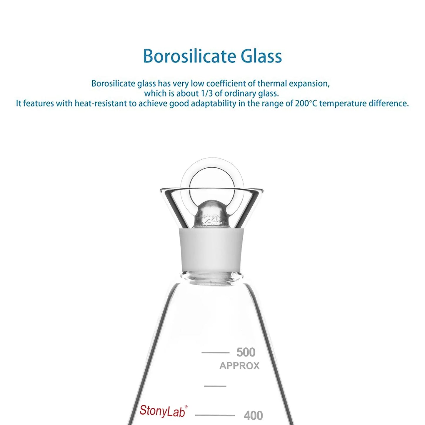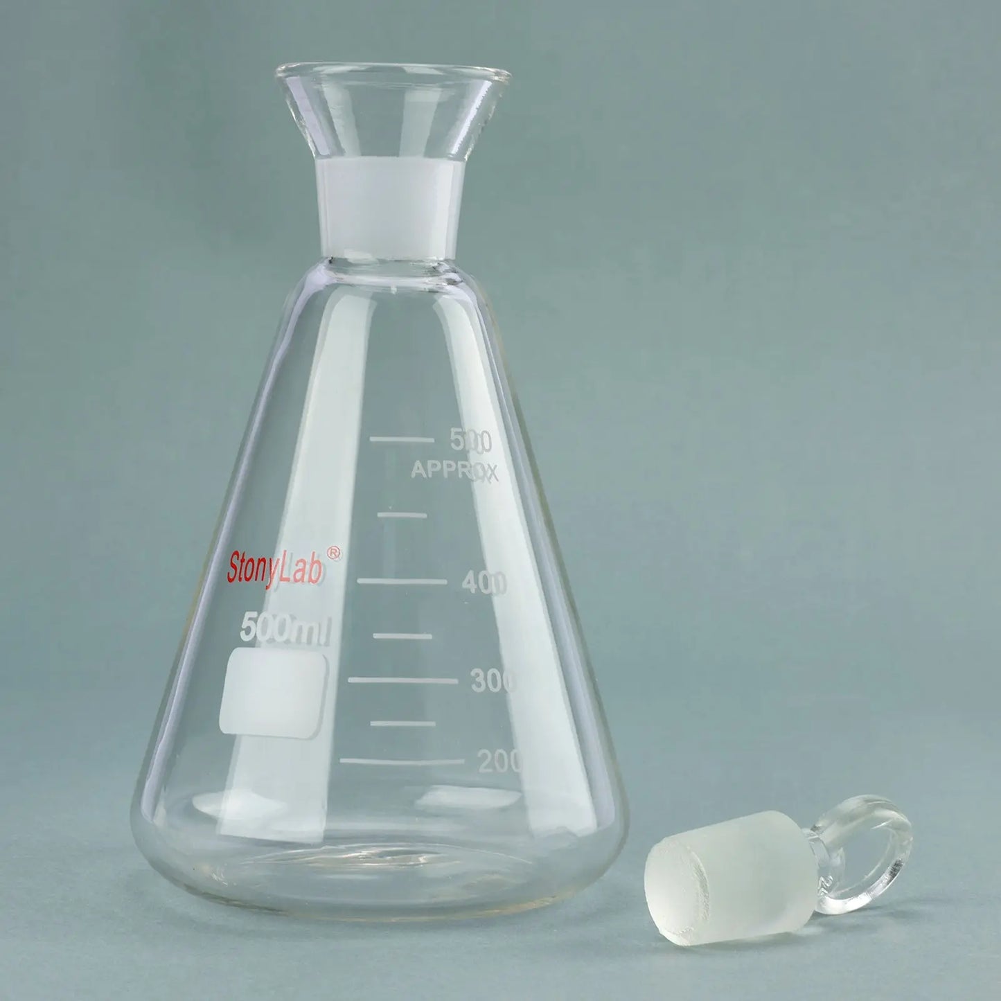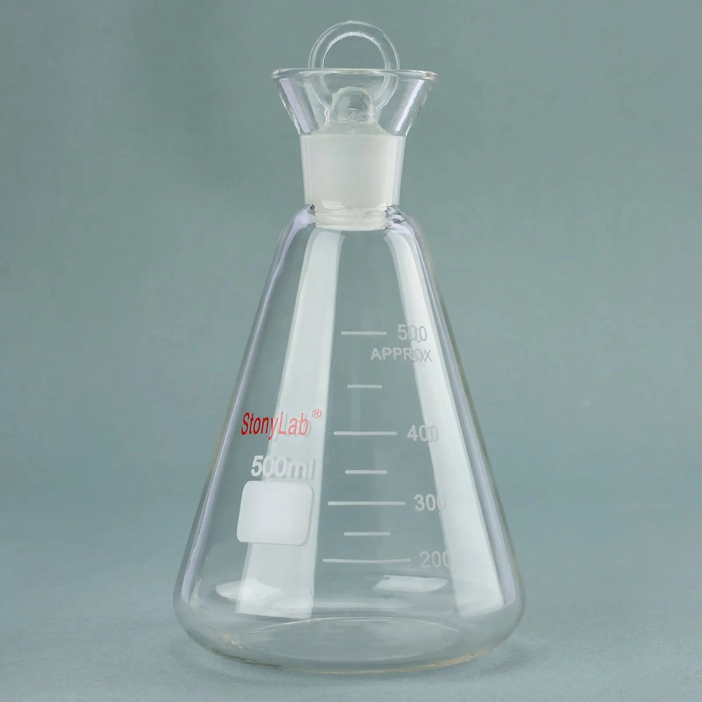 - 500 ml Capacity: Features a wide-mouth design with a standard ground glass stopper, providing easy access for adding liquids and sealing