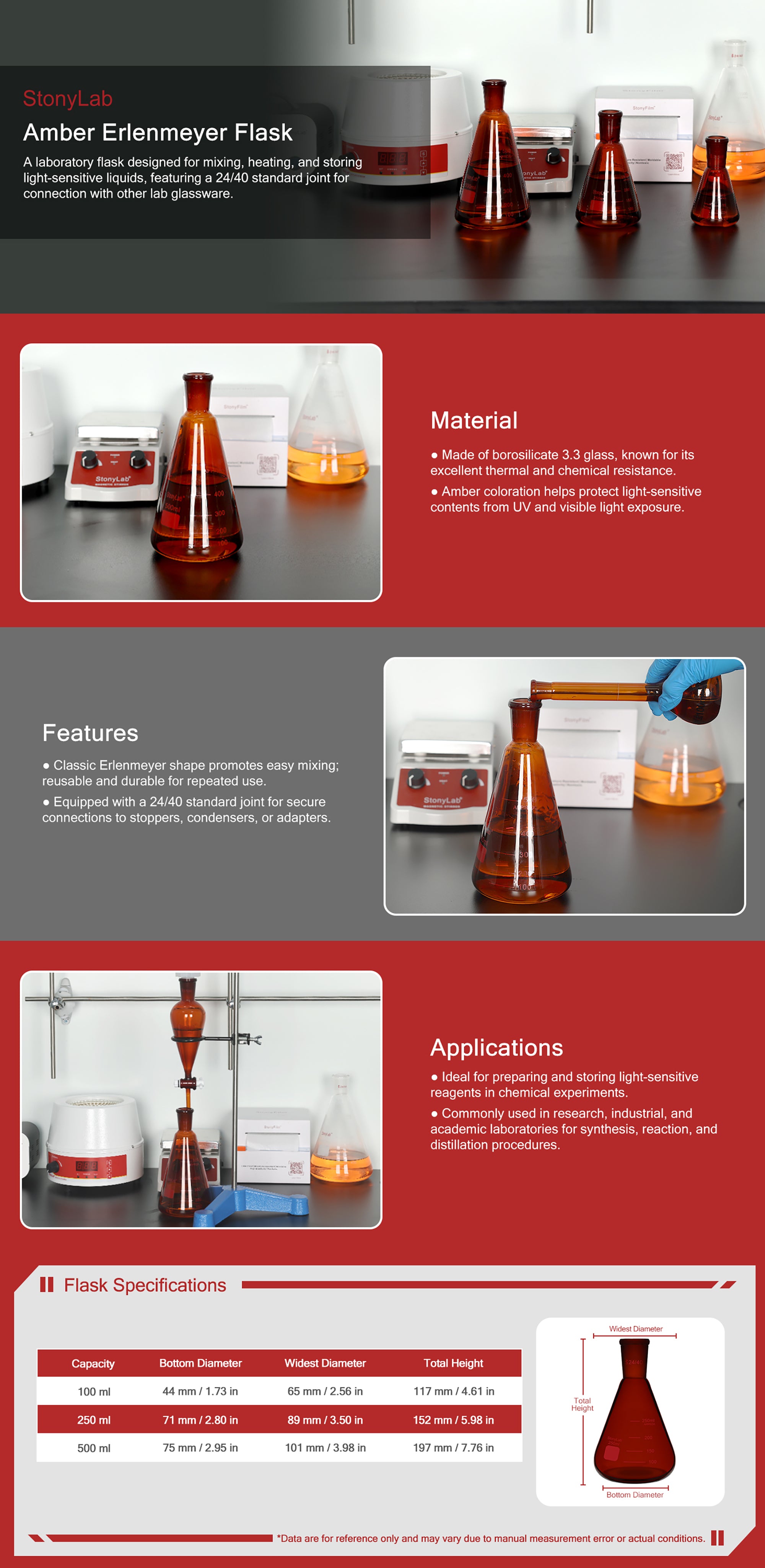 Amber Erlenmeyer Flask, 24/40 Joint, 100-500ml