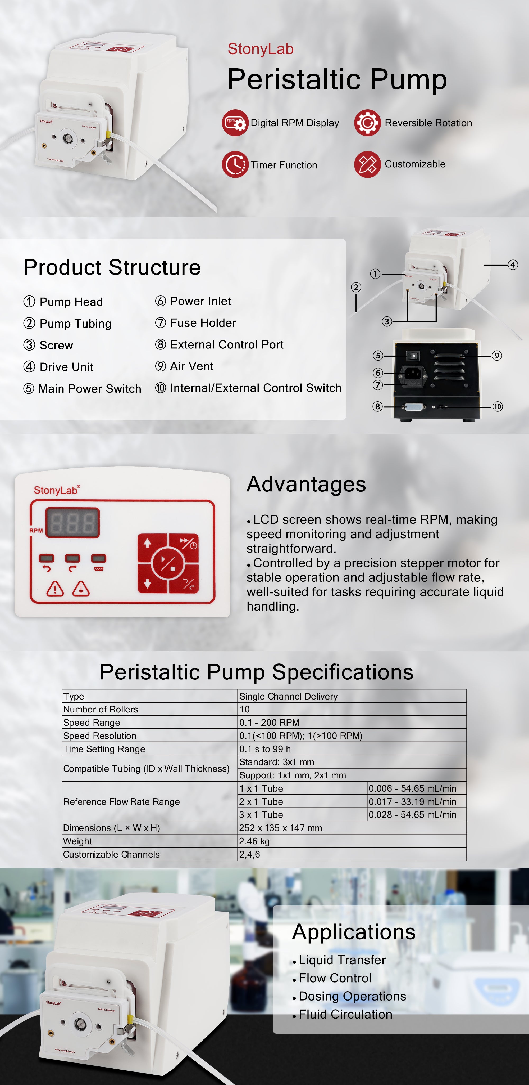 - High-Precision Stepper Motor Driven Pump: 10-roller peristaltic pump with adjustable speed: 0.1-200 RPM and timer: 0.1s-99h; reference flow range: 0.006-54.65 mL/min (note: actual flow depends on RPM, pump head pressure, and tubing dimensions)