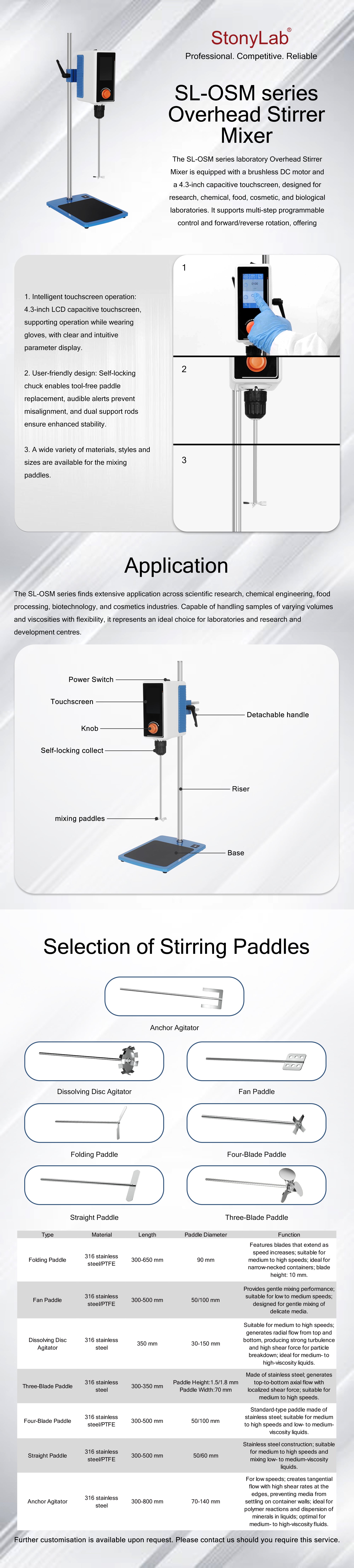 - User-Friendly Design & Flexible Options: Quick-release self-locking chuck allows tool-free impeller replacement with audible misalignment alerts. Dual support rod structure provides stability, while optimized motor and ventilation system reduce noise and extend service life. Available with stainless steel and PTFE impellers in various styles and sizes. Customization and additional accessories are also available upon request
