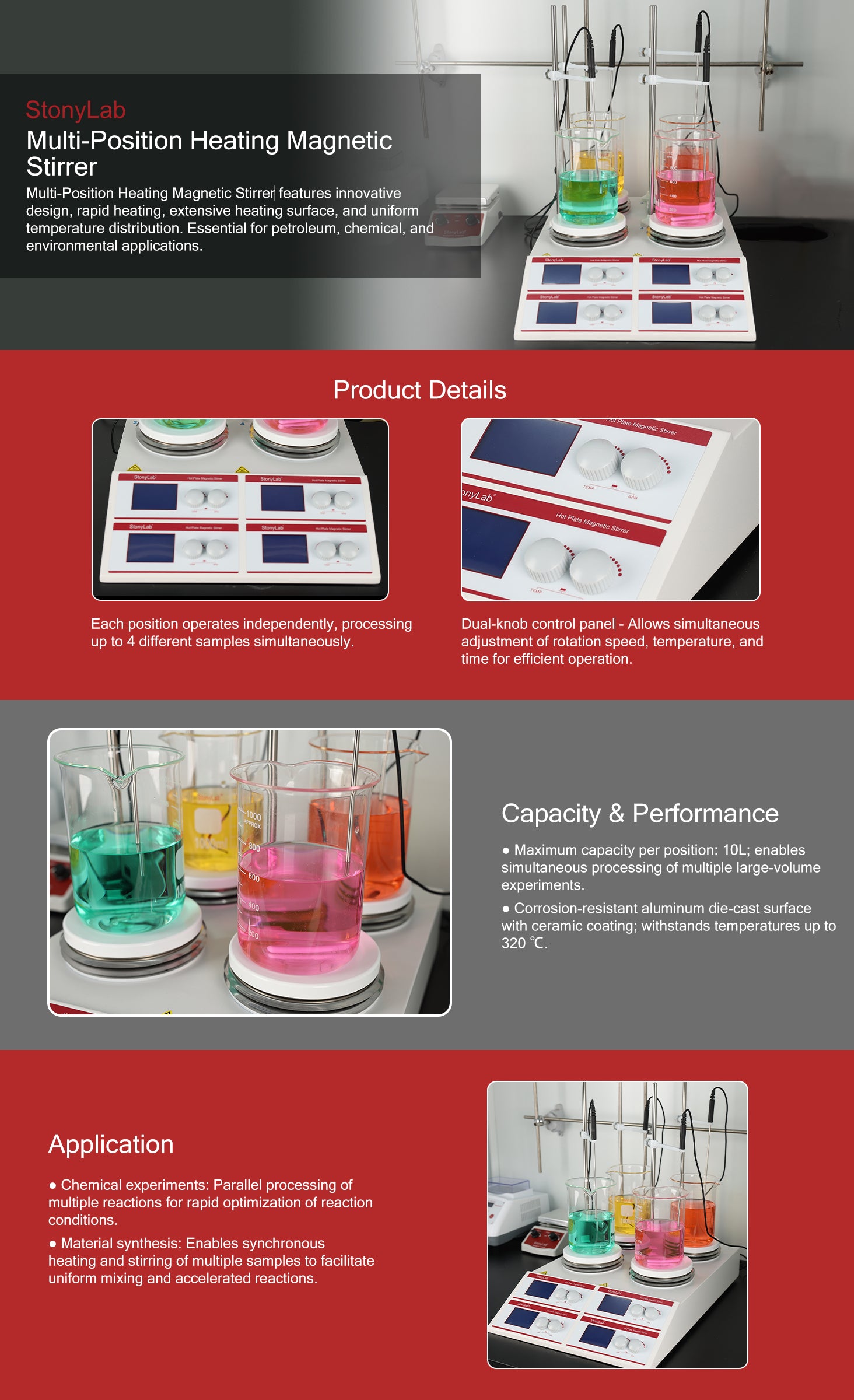 - Large, uniform heating area for simultaneous heating and stirring of multiple samples, ideal for parallel experiments and sample screening.