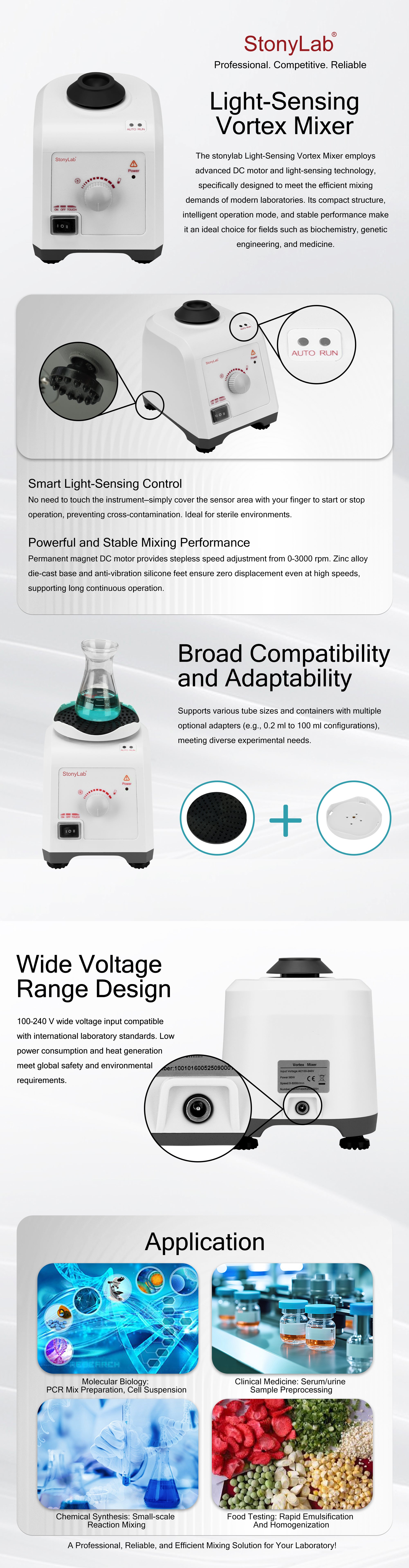Light-Sensing Vortex Mixer, 0-3000RPM,Light sensing and continuous mode, Multi-adapter
