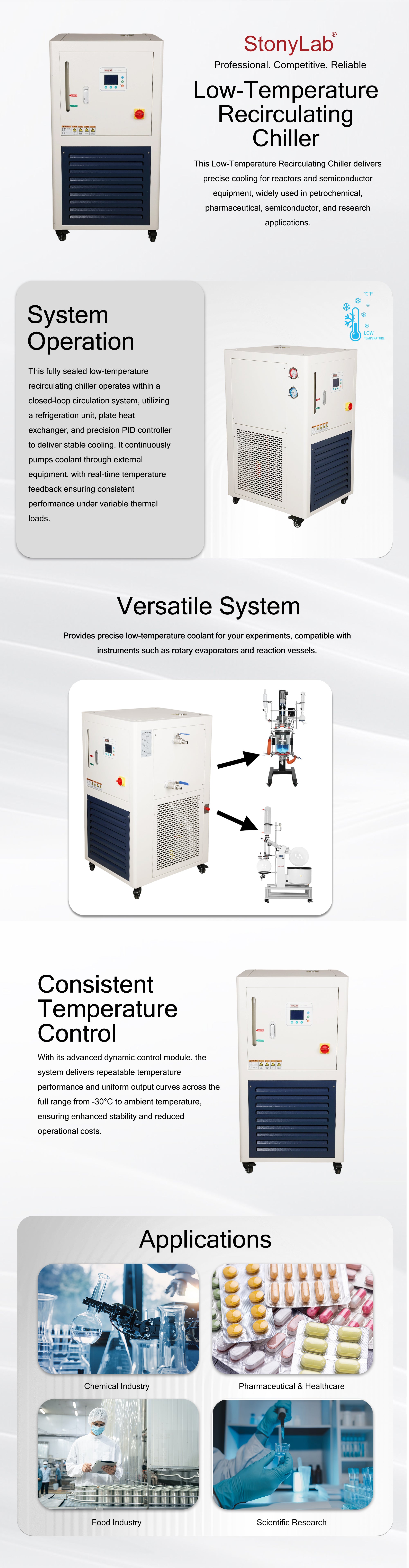 - Stable Low-Temperature Cooling: A closed-loop refrigeration unit designed to deliver reliable low-temperature cooling for industrial and research equipment, including reactors, vacuum systems, analytical instruments, and semiconductor applications