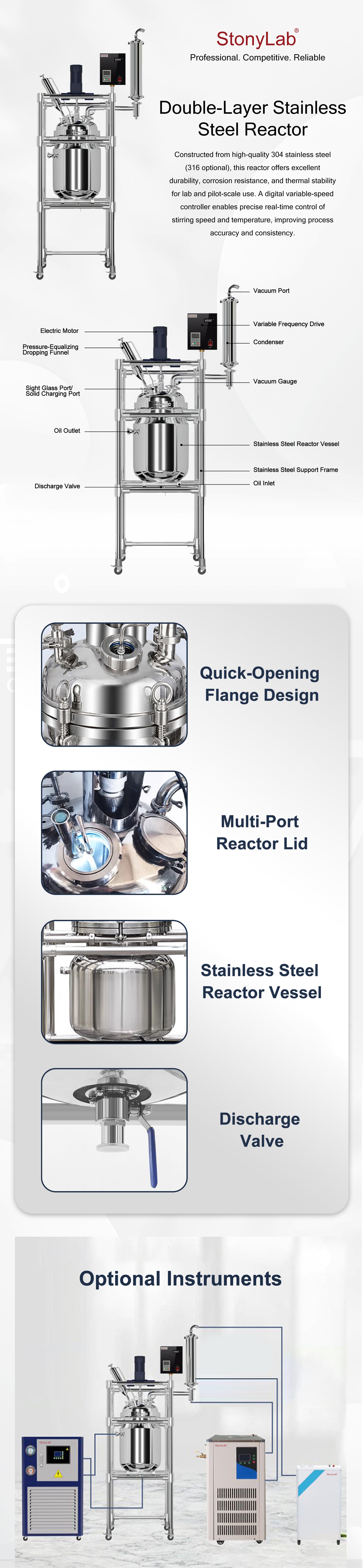 - Multiple Components Available: Customizable with various motor control systems, frequency converters, PLC temperature/pressure control modules, and multiple agitator types (anchor, frame, turbine, propeller, etc.). Number and size of openings/flanges can also be specified for feeding, temperature probes, condensers, sampling ports, gas inlet/outlet, and more.